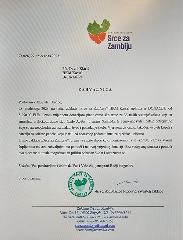 U okviru humanitarne akcije i ove je godine prikupljeno 5250 Eura ili 35 stipendija za učenike, koji bez ove pomoći u njihovoj domovini – Zambiji, ne bi mogli ići u školu, niti bi tamo imali smještaj i topli obrok. Prikupljena materijalna sredstva upućena su zakladi  Srce za Zambiju, koja će dalje financirati navedeni projekt.