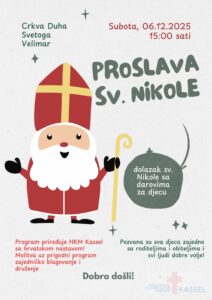 HKM Kassel zajedno sa hrvatskom nastavom priređuje proslavu sv. Nikole u subotu, 06.12. s početkom u 15 sati. Kroz molitvu, i prigodni program, koji priprema hrvatska nastava u prostorijama crkve biti će proslavljen dan Sv. Nikole. Očekuje nas i zajedničko blagovanje (Bratwurst, Waffel) i dakako prigodni darovi za djecu.