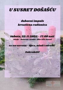 U susret Došašću, subota, 22.11.2025. u 17:00 sati, prostorije misije, – kreativnom radionicom i promišljanjem želimo otvoriti svoja srca i domove za dolazak Gospodina. Pozivamo vas da kroz zajedničko stvaranje i duhovni poticaj produbimo smisao adventskog isčekivanja.